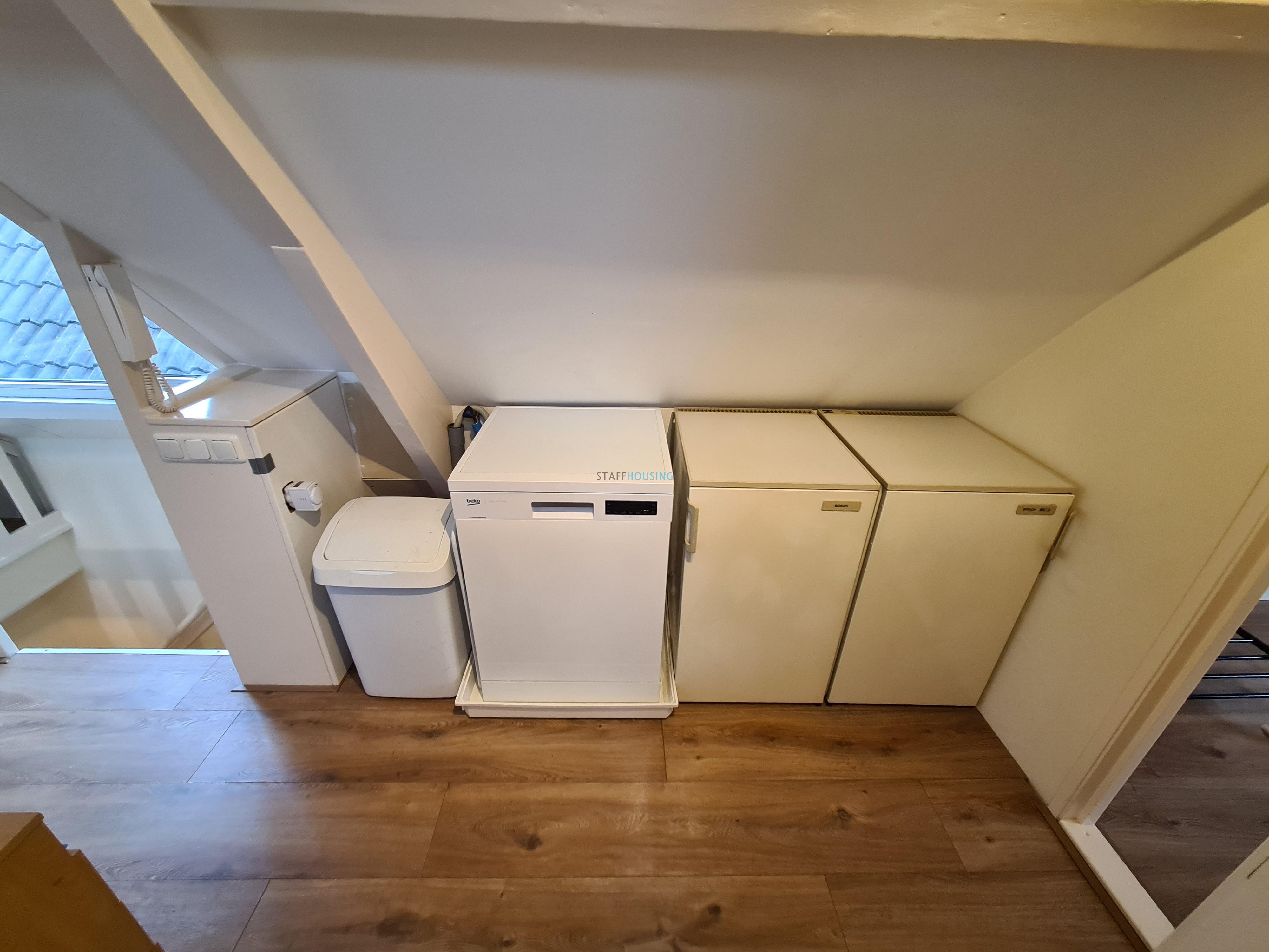 Entrance hall, spacious living room with open kitchen, modern bathroom with luxury shower, sink, washer-dryer combination, toilet and radiator and at the back side is spacious bedroom. The neat kitchen is equipped with a ceramic hob, extractor hood, dishwasher, refrigerator and freezer. The bedroom is located at the rear and has a 2 person king size bed and cupboards.